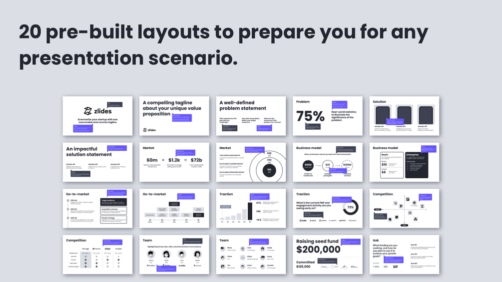 - 20 pre-built layouts: Designed to cover a wide range of presentation scenarios, including investor pitches, client meetings, and pitching competitions.