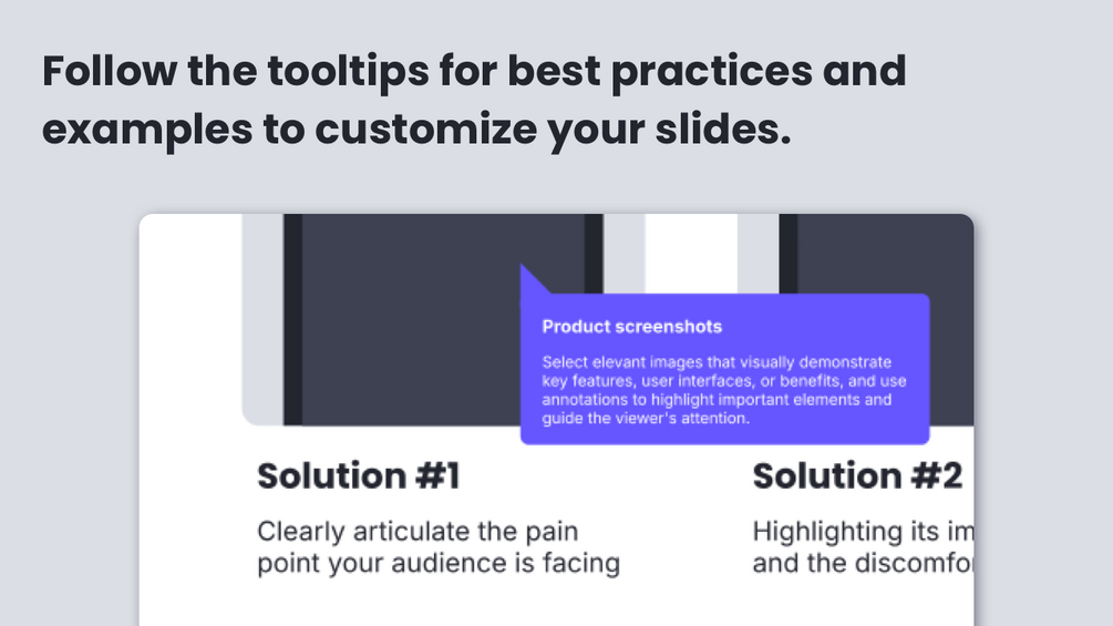 - Guided tooltips: Provide instant guidance and clarity, helping you navigate the pitch deck creation process with ease
