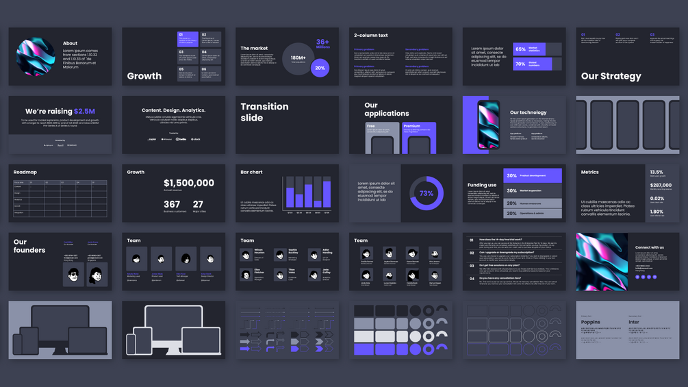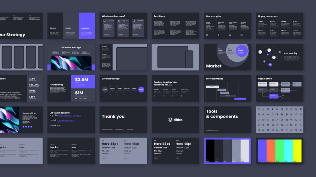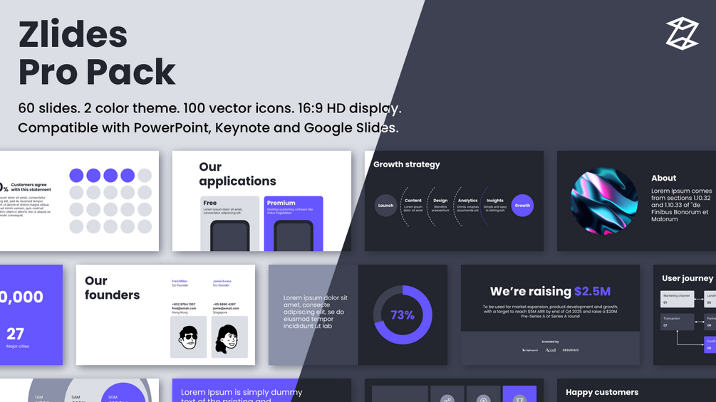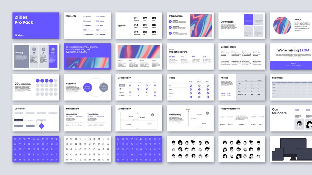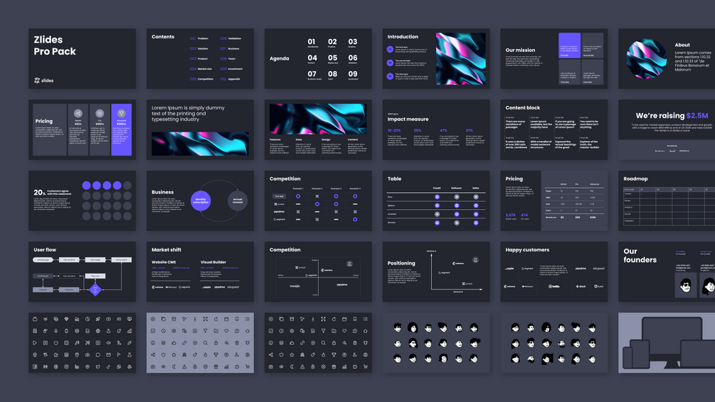 The Zlides Pro Pack is a professional presentation slides template comprising 60 unique layouts, pixel-optimized elements, editable placeholders, building blocks, and customizable components. It is the perfect template suite for startups, growing companies, and innovative projects. This template gives you the power to visualize your ideas easily and take your pitch deck to the next level.