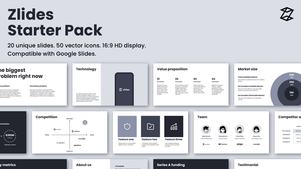 The Zlides Starter Pack is an essential presentation slides template comprising 20 unique layouts, building blocks, and customizable components. It is designed for startups and small businesses. This template gives you a taste of how flexible and easy it is to create your first pitch deck.
