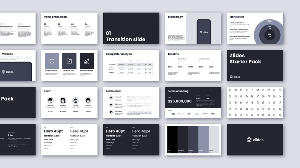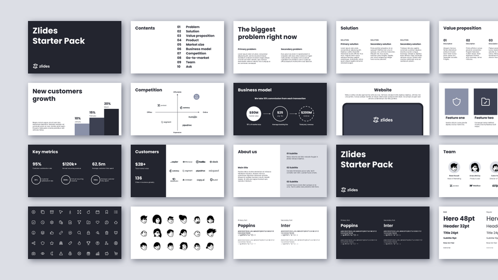 The Zlides Starter Pack is an essential presentation slides template comprising 20 unique layouts, building blocks, and customizable components. It is designed for startups and small businesses. This template gives you a taste of how flexible and easy it is to create your first pitch deck.